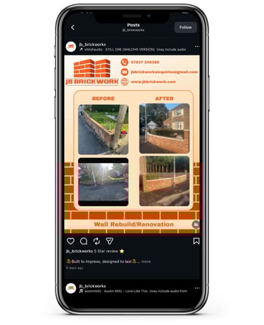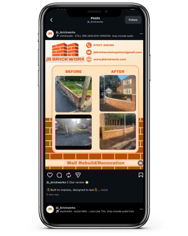 Working in discussion with JB Brickwork, we designed a custom service template to be used on their socials, mainly Instagram and Facebook. Using the Meta bubble is one of the most effective in this modern era. Providing potential customers with reliable source images of previous work will help showcase the skill at work.